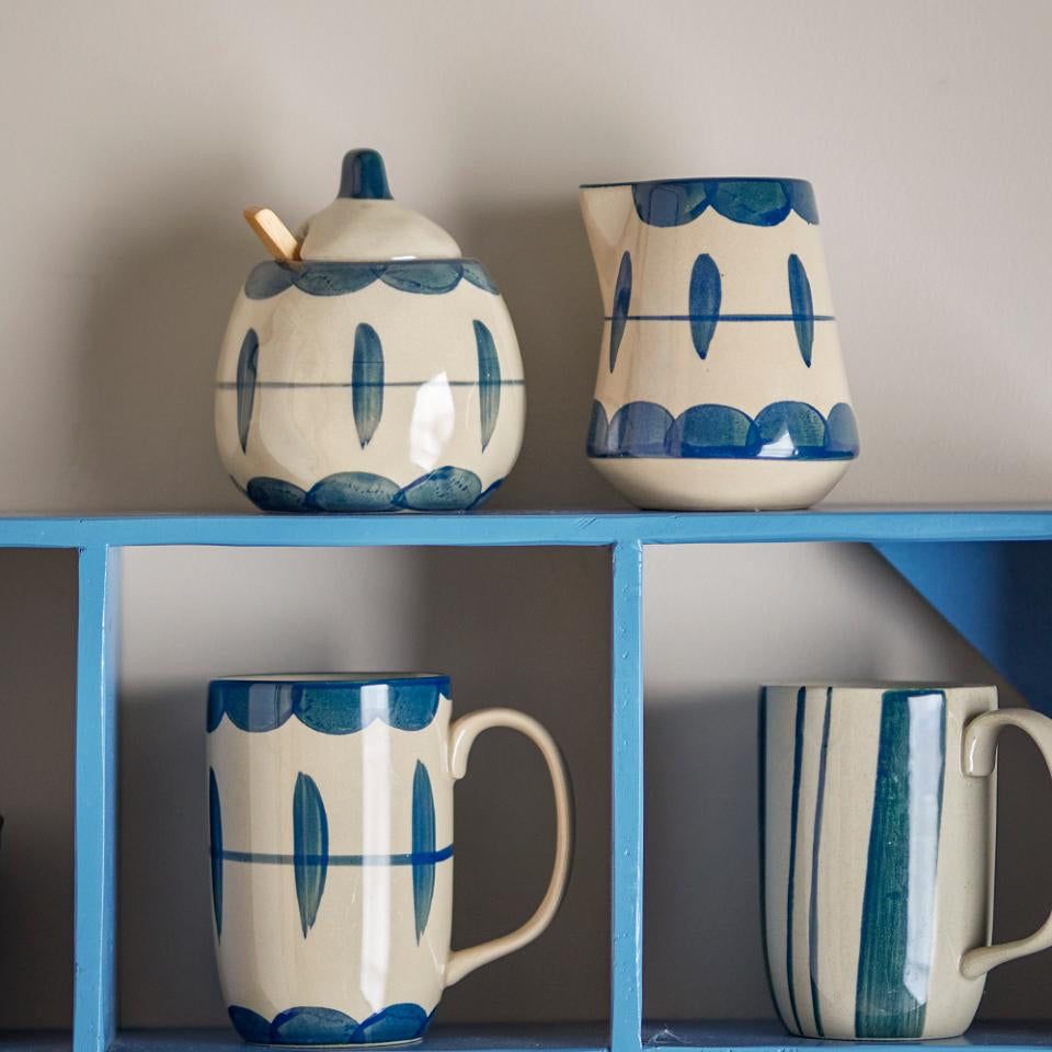 The Allium Milk Jug & Sugar Bowl by Creative Collection is a beautiful set with a matching milk jar and sugar bowl with a lid and a little spoon in bamboo wood. The stoneware is designed in a dark blue organic pattern on a natural-colored base. Place the cozy set on the kitchen table or set the dining table for afternoon tea. Each set is unique as it is decorated by hand.