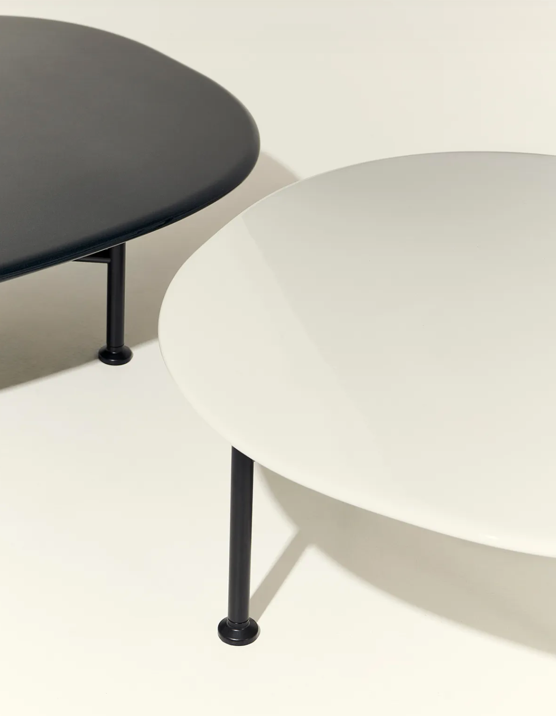 The Carmel tables can stand alone as feature pieces or be combined in clusters with others in different sizes and colors. Small tables are available in Rock Red or Pacific Blue; medium in Clam White, and large in Midnight Black, with a randomized crystal finish applied to black and white tables.