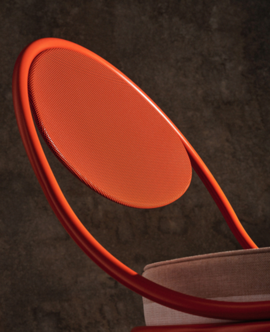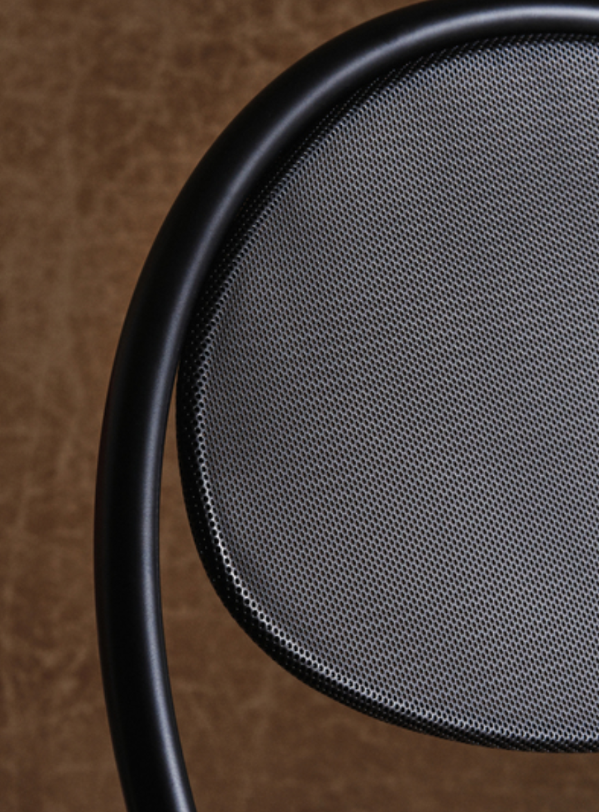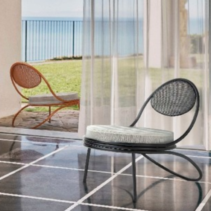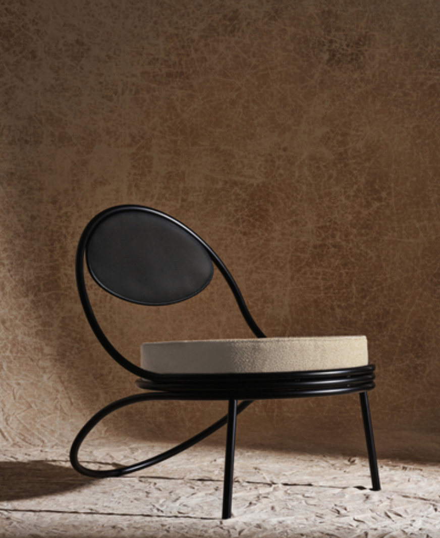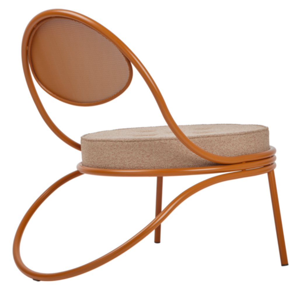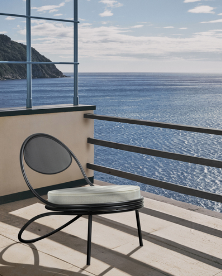 The Copacabana Lounge Chair was created in 1955 by Mathieu Matégot. The low Copacabana Lounge Chair has the impression of being designed with a single pencil stroke and the elegance of the chair resides in the continuous force of the line. It is constructed on the basis of a curved tubular frame that surrounds the round seat and the back made of the perforated metal Rigitulle sheet that often signifies the work of Matégot, ending with the continuous rear legs. The lounge chair, available in black and a wide range of upholstery on the sit pouf, is ideal for lounge areas and waiting areas as well as the private home.