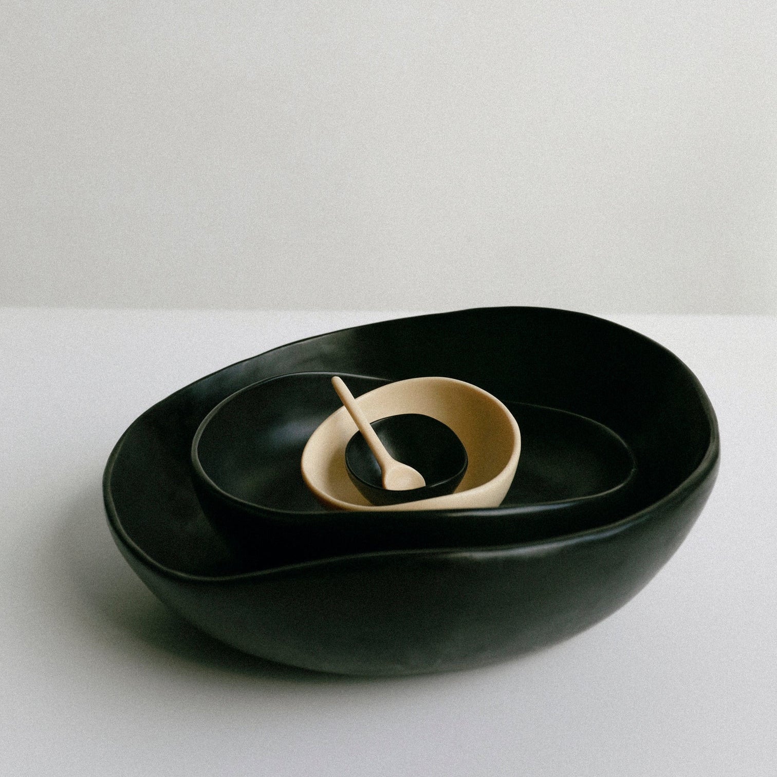 Handmade in Dinosaur Designs’ Sydney studio, the Flow Spice Dish is defined by its soft, subtle curves. Designed to sit effortlessly alongside the larger Flow bowls, this piece is the perfect size for condiments, spices or small accompaniments at the table. The resin-casting process creates natural variations in colour and pattern, giving each dish its own unique presence and character.