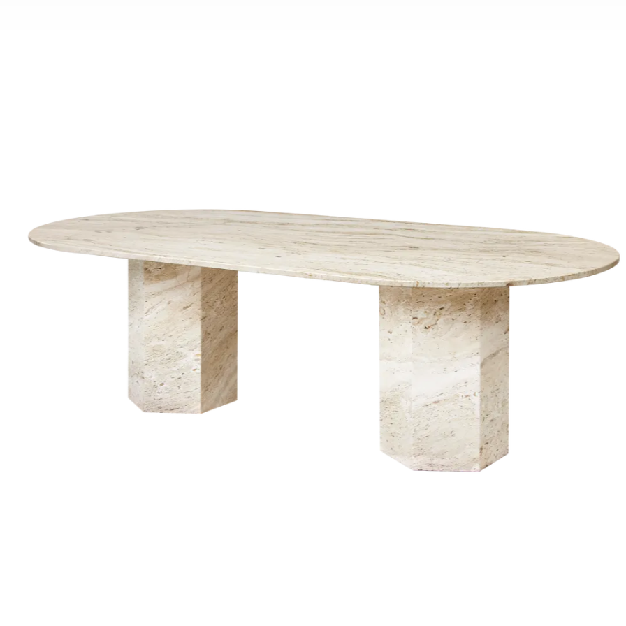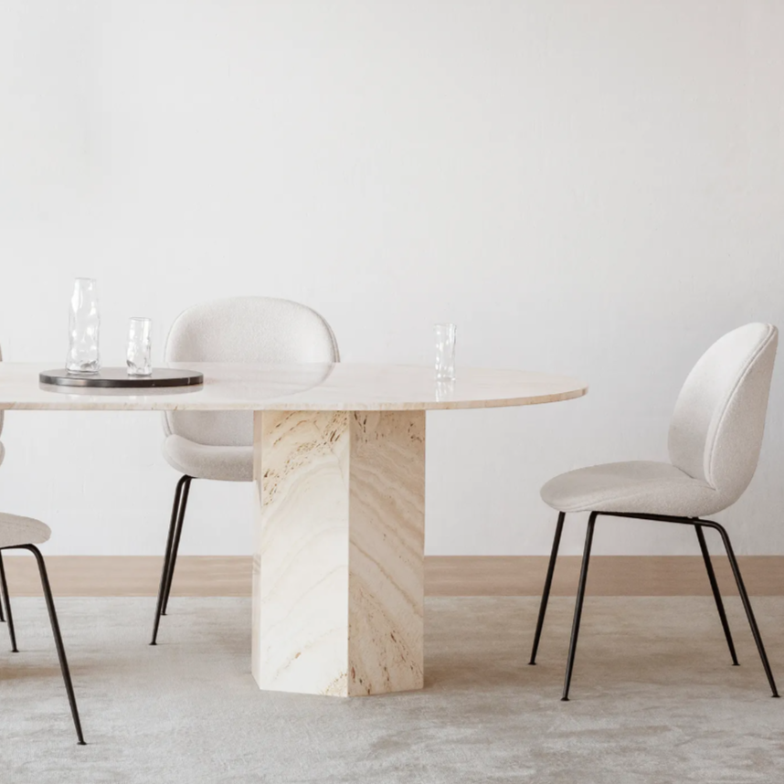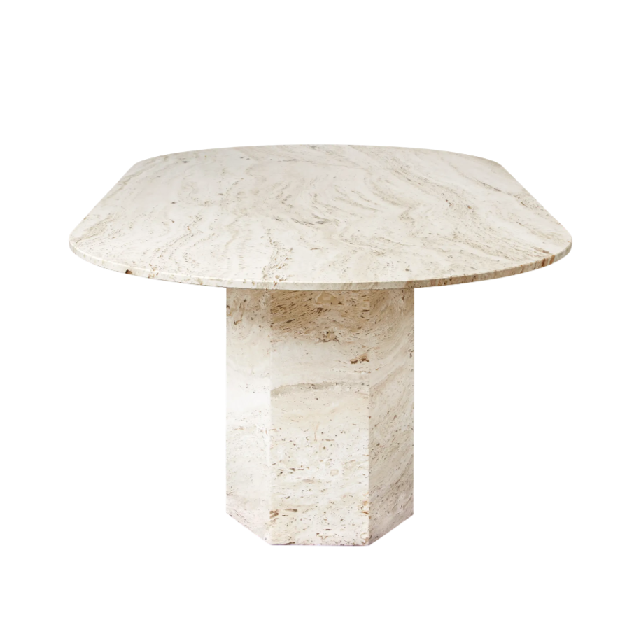Named after the epic poems of ancient times, GamFratesi’s Epic Table for GUBI is a sculp- tural piece of furniture inspired by Greek columns and Roman architecture. Originally made in Italy from travertine stone, the table’s new variant marks the first time GamFratesi has worked with steel plates, which are galvanized, lacquered, and then treated with a series of hand-fin- ishing processes to create a unique surface expression for each table. The table’s monolithic form remains, now with an industrial expression, in which a new detail can be discovered with every use. The collection brings personality to private settings and an intriguing sense of weight and tactility to public and hospitality spaces, where its resilient surfaces offer exceptional levels of durability. The varying heights and diameters within the Epic Table Collection mean a single monochromatic table can stand alone or be combined in dynamic clusters of varying material, height and color.