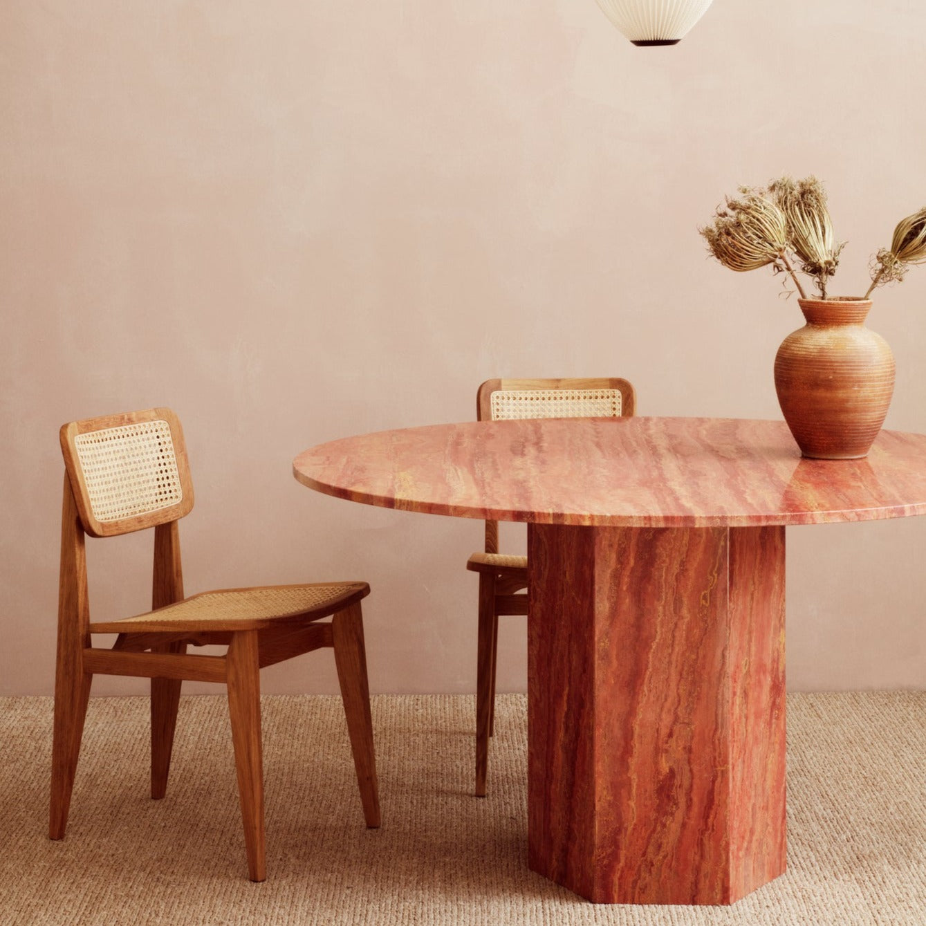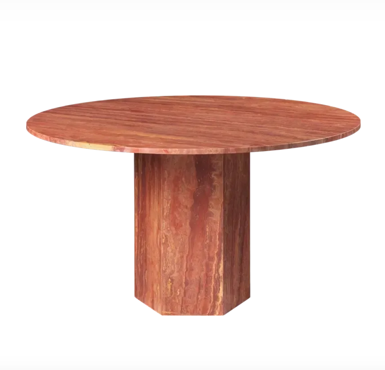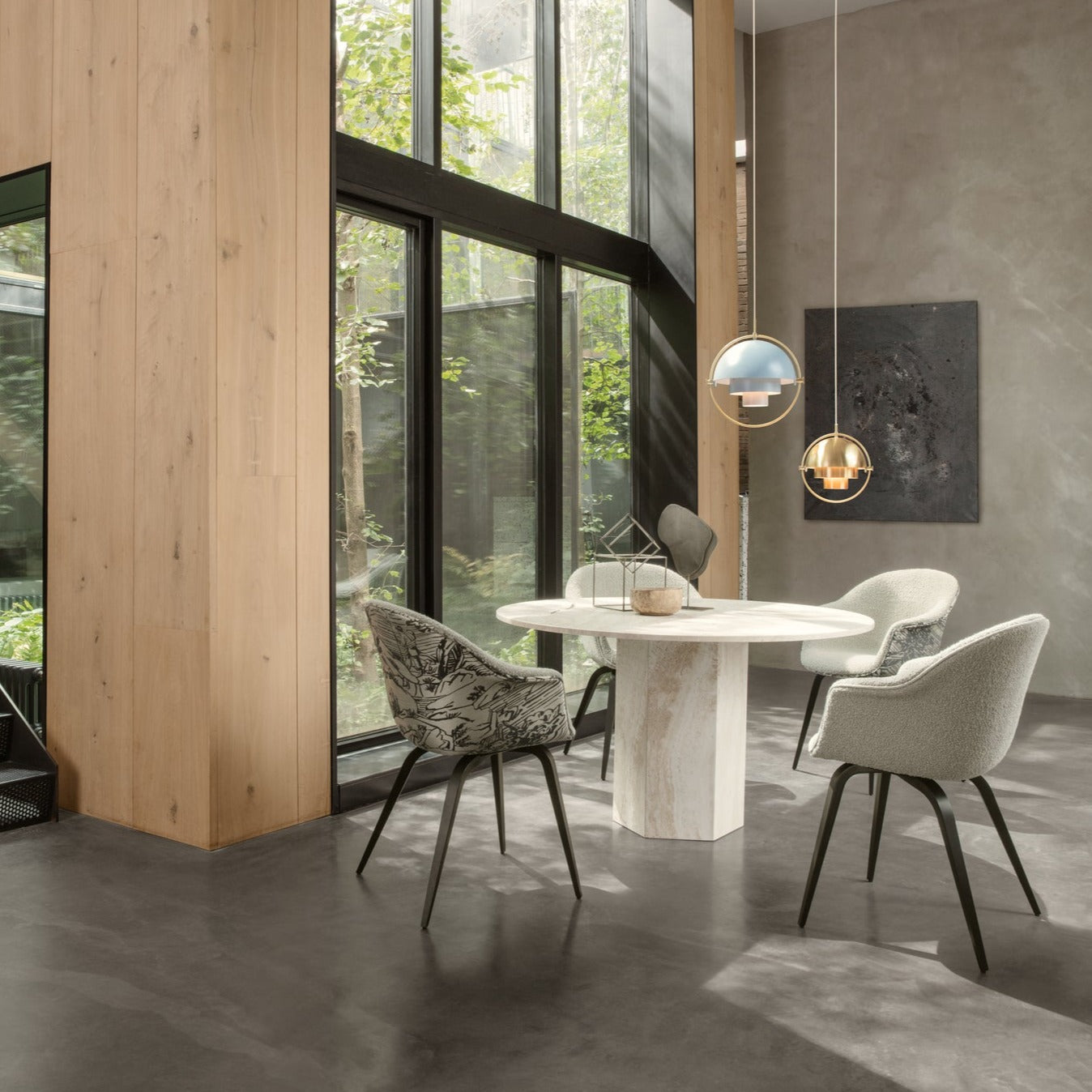 Named after the epic poems of ancient times, GamFratesi’s Epic Table for GUBI is a sculp- tural piece of furniture inspired by Greek columns and Roman architecture. Originally made in Italy from travertine stone, the table’s new variant marks the first time GamFratesi has worked with steel plates, which are galvanized, lacquered, and then treated with a series of hand-fin- ishing processes to create a unique surface expression for each table. The table’s monolithic form remains, now with an industrial expression, in which a new detail can be discovered with every use. The collection brings personality to private settings and an intriguing sense of weight and tactility to public and hospitality spaces, where its resilient surfaces offer exceptional levels of durability. The varying heights and diameters within the Epic Table Collection mean a single monochromatic table can stand alone or be combined in dynamic clusters of varying material, height and color.