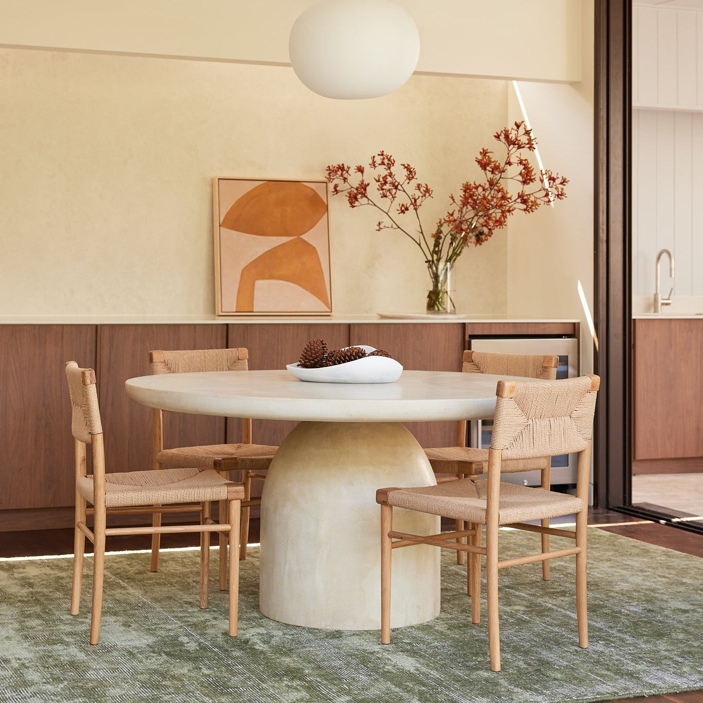 Part of Bodhi Living's Solstice Collection, the Nexus Round Dining Table is meticulously crafted with a solid hardwood and fiberglass frame, hand-rendered in tinted micro cement. This innovative material offers a seamless, stone-like finish that is both robust and elegant, suitable for indoor and covered outdoor settings.
