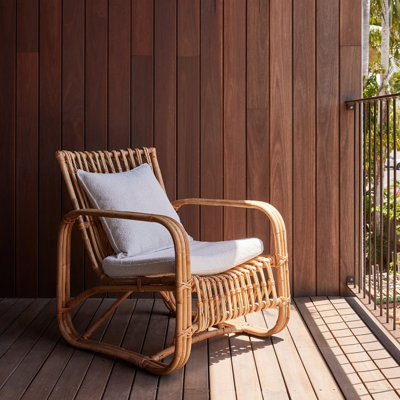 The Safi Armchair is handcrafted from natural rattan with removable fabric cushions for easy care and lasting comfort.